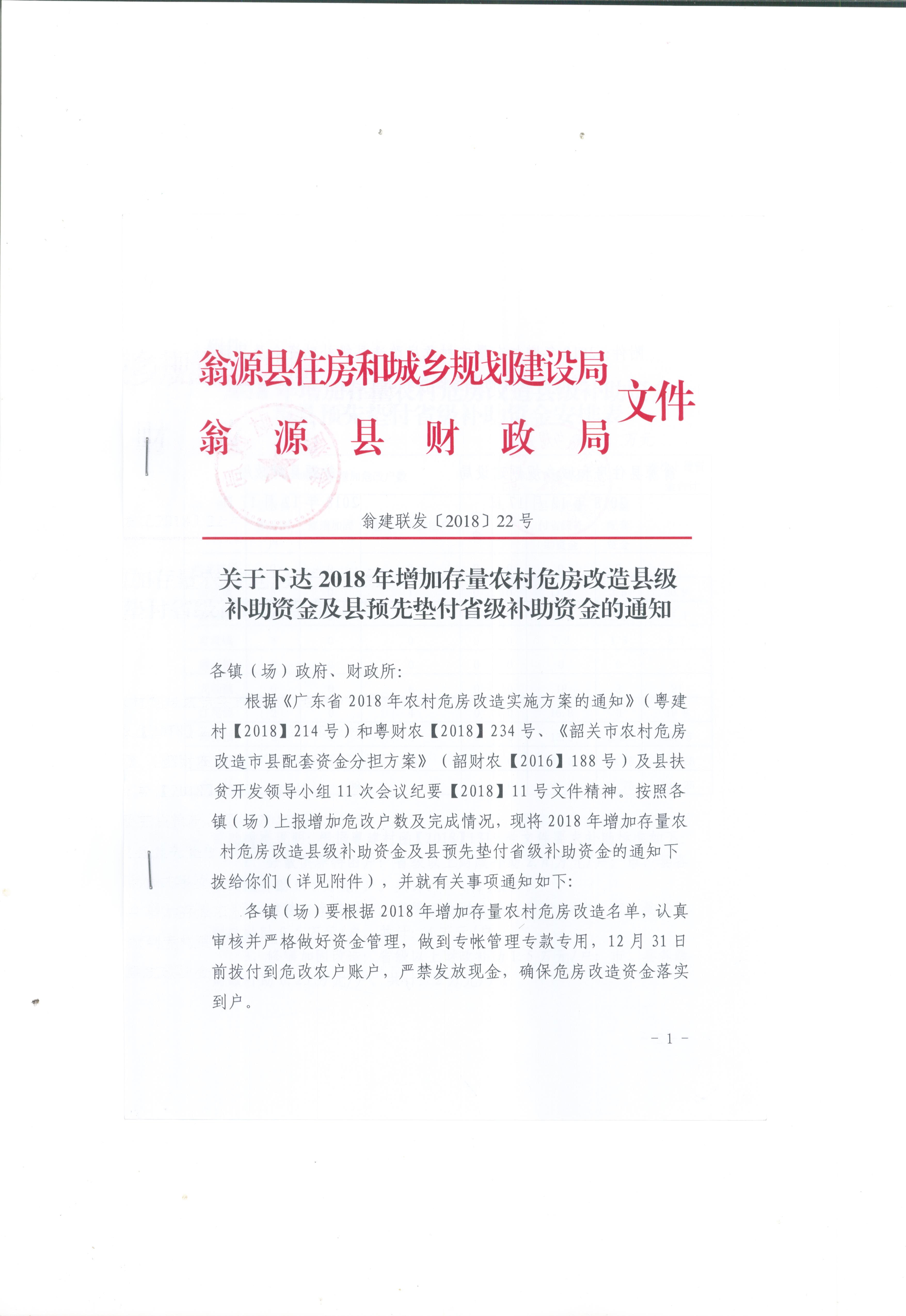 翁建联发[2018]22号-关于下达2018年增加存量农村危房改造县级补助资金及县预先垫付省级补助资金的通知