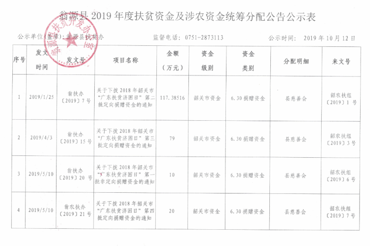 2019年9月扶贫资金及涉农资金统筹分配公告公示表