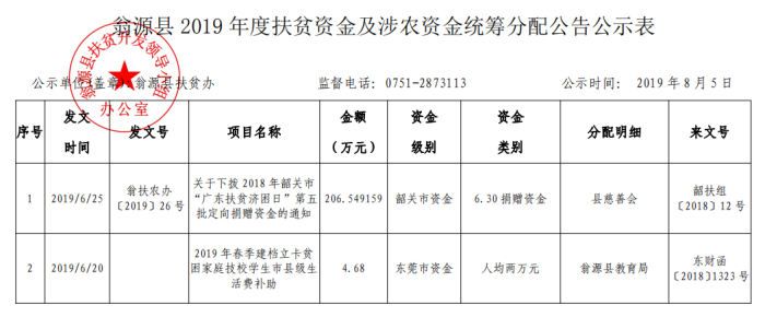 2019年6月扶贫资金及涉农资金统筹分配公告公示表