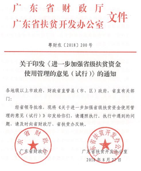 关于印发《进一步加强省级扶贫资金使用管理的意见(试用)》的通知(粤财农[2018]200号 )